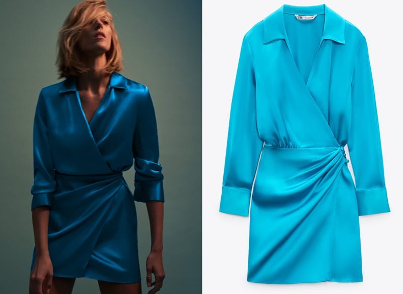 A Zara han llegado recientemente interesantes novedades como este vestido satinado cruzado, un modelo confeccionado en poliéster y elastano que cuenta con un bonito acabado en azul vigoré y que se vende en tallas XS a XL por un precio de 29,95 euros.