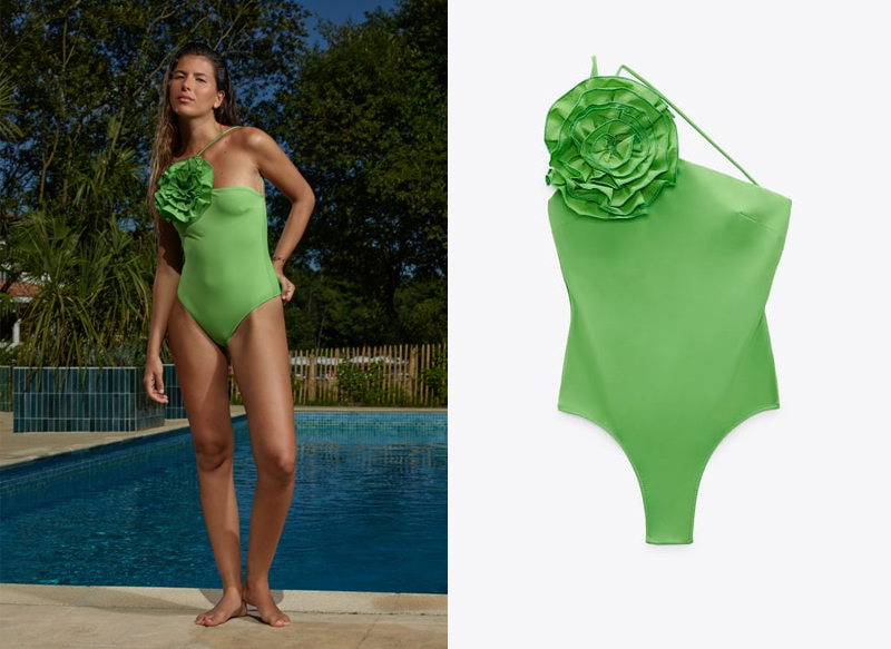 Para ir a la playa podemos valorar muchas posibilidades diferentes, pero si te gustan looks que se alejen de lo más común, este bañador asimétrico flor de Zara es para ti. Está a la venta en color verde y en negro por un precio de 27,95 euros.