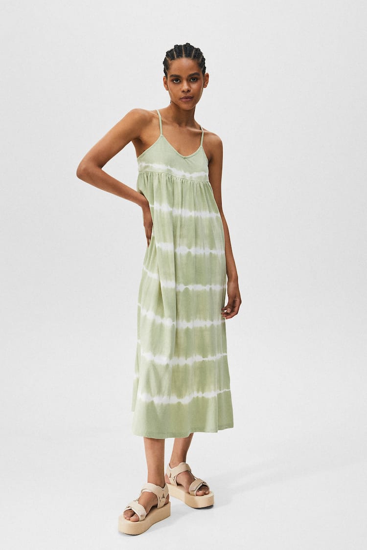 Otro vestido largo de Pull&Bear que resultará especialmente interesante para este erano es este. En tonos verdes, llama la atención, sin duda, su estampado tie dye, que lo convierten en una prenda fresca y cómoda a la vez que sofisticada. Además, también interesa su precio, pues lo puedes conseguir por tan solo 19,99 euros.