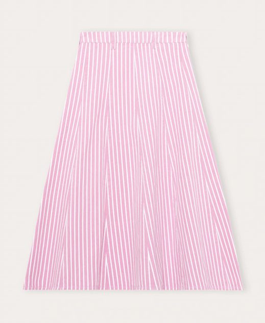 La marca Ganni, disponible en El Corte Inglés, nos propone este diseño de falta de corte midi con un diseño con mucho vuelo, para un estilismo favorecedor, casual y muy veraniego. Tiene un bonito estampado de finas rayas en color rosa sobre fondo blanco y está confeccionada en algodón 100% orgánico. Con el 30% de descuento, su precio es de 157,50€. Aquí tienes el enlace.