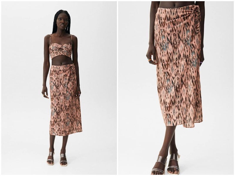 Seguimos con la lista de la colección de verano de Pull&Bear con estas faldas muy ponibles para ir cómoda y fresquita sin renunciar a tu estilo. Elegimos esta falda pareo midi con detalle de falso nudo en la cintura, abertura lateral y confeccionada en 100% algodón. La puedes encontrarla en la tienda online en los talles S, M o XL, pero son las últimas unidades. Está disponible en dos colores: rosa o verde. Tiene un valor de 22,99 euros. Puedes completar el look con el top a juego del mismo estampado a 17,99 euros.