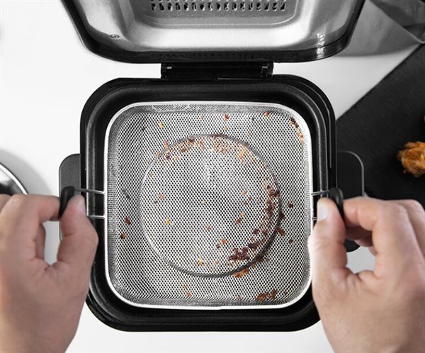 Para limpiar tu freidora debes asegurarte de que está desenchufada y que el aceite está frío. Cubre la zona con un papel absorbente para proteger la superficie sobre la que se va a realizar la limpieza. Comienza retirando el aceite usado, con ayuda de un embudo, vertiéndolo en un recipiente de cristal. Es recomendable que vayas almacenando el aceite en una botella grande para llevarlo a reciclar cuando la llenes. Posteriormente, cuando ya no quede aceite en la freidora, pasa un papel de cocina para atrapar con facilidad los restos de comida que se hayan quedado al fondo.