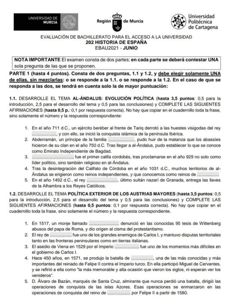 Este es el caso de Madrid, donde los exámenes son más estrictos que en comunidades como Murcia donde dos de las preguntas del examen de historia consiste en rellenar los huecos de una frase. Es decir, una pregunta más digna de los cursos de primeria que una prueba de acceso a la comunidad. En la región murciana la prueba de Historia de España del año 2021 contaba con una pregunta separada en dos puntos en los que se preguntaba por un tema, Al-Ándalus y su evolución política donde para comprobar los conocimiento de los estudiantes respecto a este área debían completar cinco frases. Una manera de evaluar que recuerda más a los cursos de Primaria.