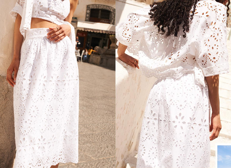 El blanco es un color siempre una gran opción para los eventos veraniegos, sobre todo dado su contraste con el color moreno de la piel. En Primark hay diferentes prendas que puedes encontrar como esta falda blanca con bordado inglés.