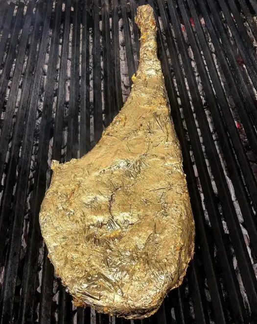 El menú de todos los restaurantes de Salt Bae destaca por su extravagancia y sus elevadísimos precios. En la cuenta de Instagram del chef se le puede ver en acción preparando, delante de los propios comensales, enormes trozos de carne, con una buena dosis de espectáculo. A algunos clientes incluso les da de comer en la boca. Además del famoso “Golden Tomahawk”, la carne envuelta en pan de oro a 1.000 dólares la pieza, también se puede probar la “Gold burger”, que se sirve aderezada con una salsa de un intenso color amarillo.