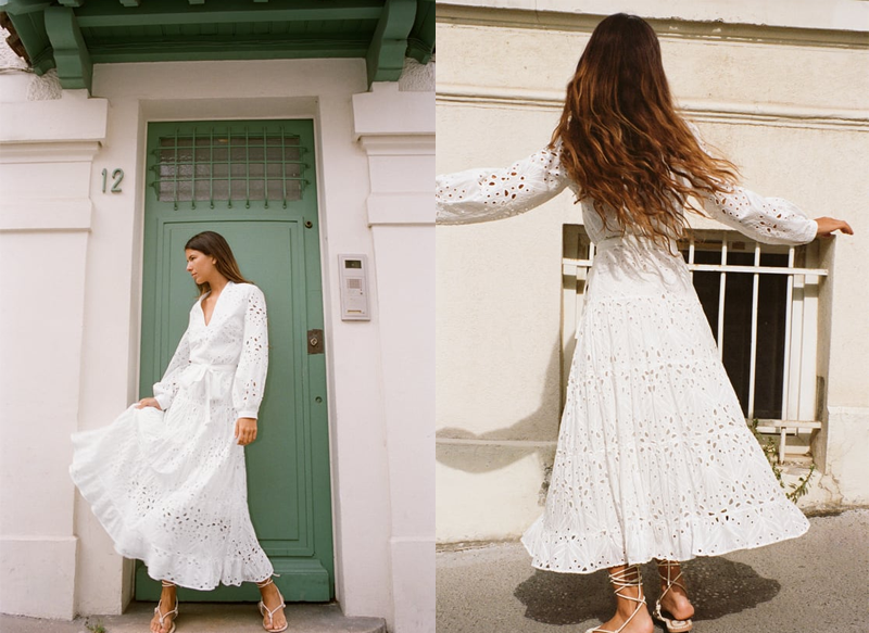 Es un vestido midi de escote pico y manga larga que tiene cinturón lazada en el mismo tejido y detalle de bordados perforados. Además, cuenta con un forro interior combinado a tono. Es una prenda perfecta para este verano.