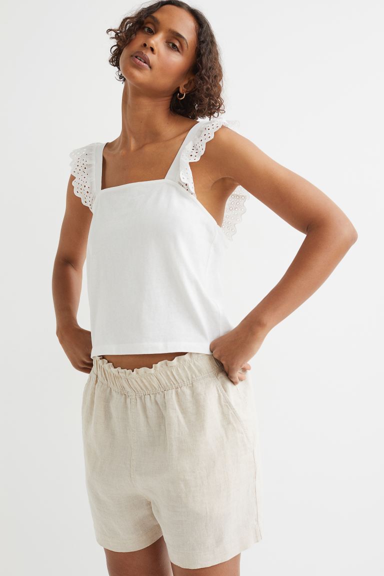 Elaborado en algodón, este top de H&M es uno de los más interesantes si lo que buscas es una prenda cómoda y femenina que pueda combinar con todo tu armario. Además de por su color blanco, también destaca por detalles como sus volantes, que lo convierten en una prenda romántica y muy veraniega. En cuanto a su precio, ahora lo puedes conseguir por tan solo 5,99 euros cuando antes costaba 14,99. Una gran oportunidad.