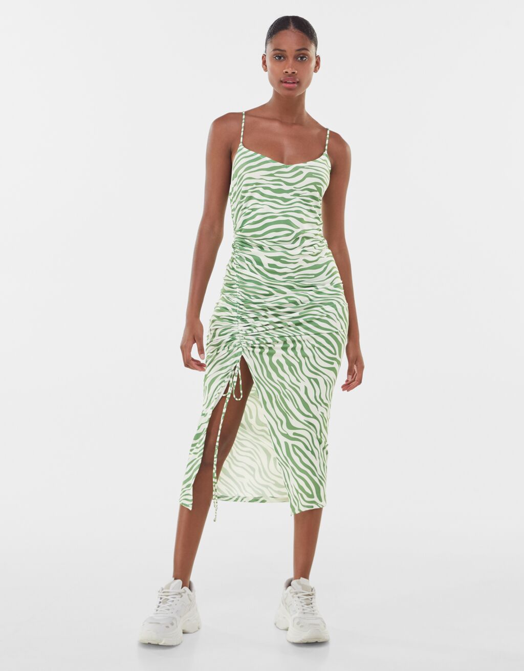 Otra de las prendas de más éxito esta temporada en la hermana pequeña de Inditex, es este alegre y juvenil vestido, cómodo y tan ideal para el día a día como para llevar a la playa o a la piscina. Es de tonos blanco y verde, con un estampado de cebra, algo que vamos a ver con mucha frecuencia en los próximos meses, ya que es la tendencia del momento. El corte es sencillo, de tirantes y escote redondeado, entallado y ajustado al cuerpo y con una abertura en un lateral con un bonito detalle fruncido. Confeccionado en 96% poliéster y 4% elastano, puede ser tuyo por 17,99€.