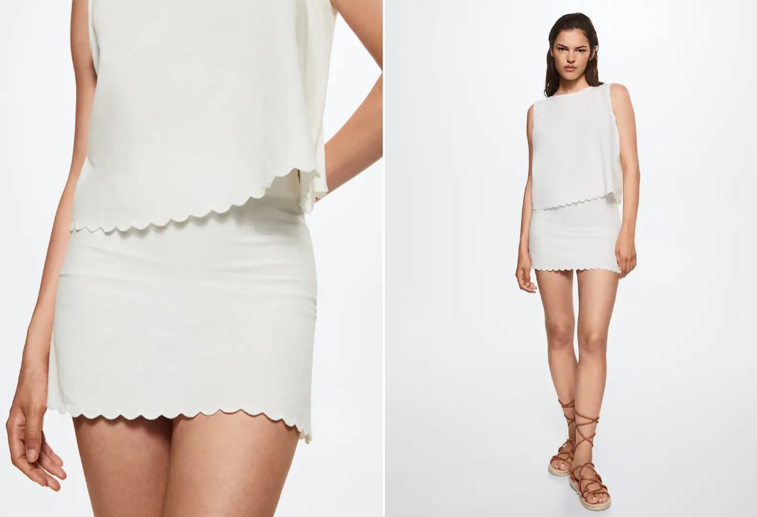 Esta sencilla falda de Mango es una de las mejores opciones para combinar con el resto de prendas de tu armario. De color blanco y con una bonita onda en la parte inferior, podrás ponértela con todo y completarla tanto como con la blusa de su conjunto como con cualquier top. Además, está disponible por 25,99 euros. Una buena oportunidad.