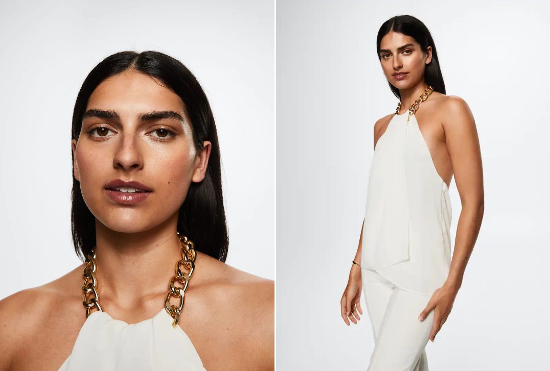 Elegante y sofisticada, esta blusa de Mango, además de muy favorecedora, es también sencilla. Con cuello halter y cadena en la parte superior, su bonito color blanco hace que sea perfecta para combinar con todo. Además, la puedes conseguir ya en tienda y web por solo 39,99 euros. La querrás llevar a todas partes.