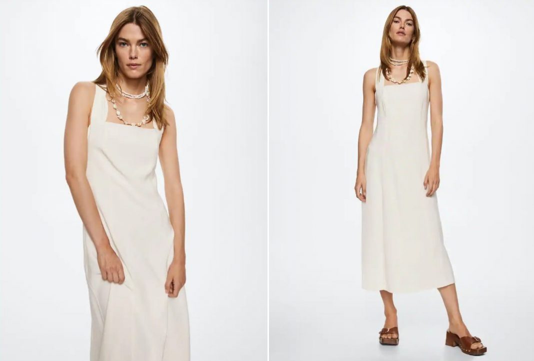 Este vestido de corte midi de Mango llama la atención por contar con una gran cantidad de detalles que destacan. Su escote cuadrado, por ejemplo, es uno de los más favorecedores. Además, también cuenta con tiras cruzadas en la espalda, que estilizan la figura. En cuanto a su precio, lo puedes conseguir por 39,99 euros. Será una buena inversión.
