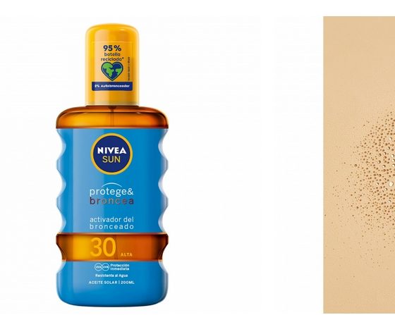 El último de los protectores solares que te recomendamos es este aceite solar spray de Nivea, que al mismo tiempo que protege también broncea. Este aceite contiene extracto natural de promelanina, que estimula el proceso natural de bronceado de la piel., Sin embargo, gracias al protector solar 30 y a la protección UVA/UVB, este aceite solar protege la piel de los dañinos rayos solares.