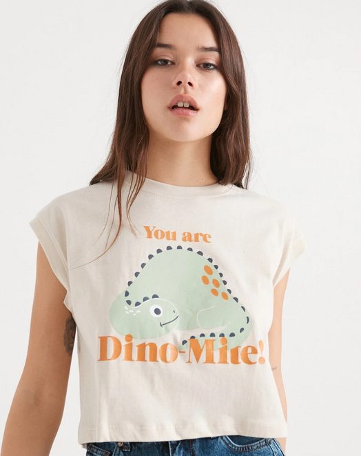 Si eres fan de los dinosaurios, esta camiseta de Inside, puede ser una de tus favoritas este verano. Es de corte cropped y con un diseño desmangado muy casual. El cuello tiene forma redondeada y es de algodón en color beige con un dibujo de un dinosaurio en la parte frontal, y un simpático texto en contraste. La puedes conseguir en El Corte Inglés por solo 3,99€. Aquí tienes el link directo.