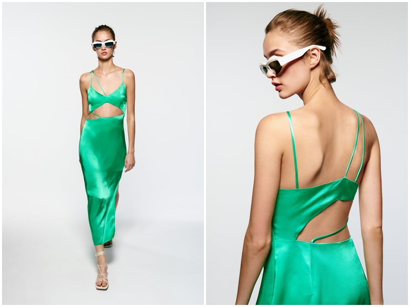 Seguimos con vestidos que seleccionamos en esta lista, un modelo satinado asimétrico. Puedes encontrar disponibles en el catálogo de Zara en color verde ideal para una boda porque representa el éxito, la confianza y la elegancia. Este es un vestido midi de escote en pico con tirantes finos. Tiene detalle de abertura en cintura y bajo con abertura lateral. Cierre con cremallera oculta en costura. El material es 70% viscosa y 30% poliéster. Su precio está rebajado en un 25% y cuesta 25,99 euros.