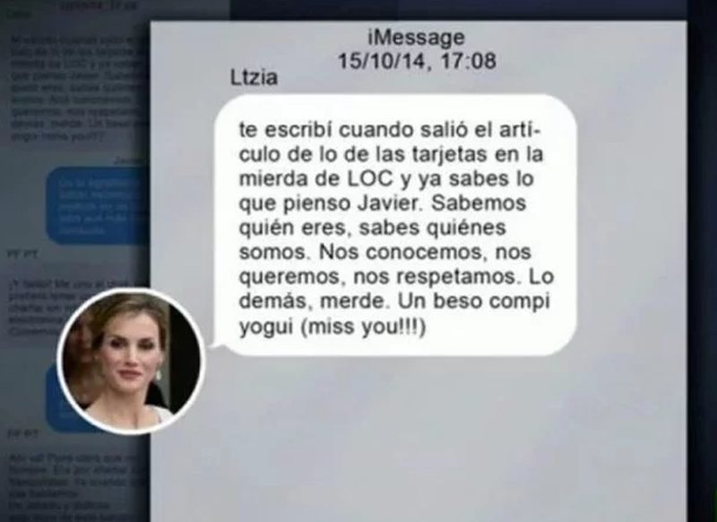 Los mensajes fueron filtrados a la empresa, y en ellos Letizia Ortiz le mostraba su apoyo: «Sabemos quién eres, sabes quiénes somos. Nos conocemos, nos queremos, nos respetamos. Lo demás, merde. Un beso, compi yogui». Esta filtración provocó un gran enfado en el rey, con la consecuente bronca a su mujer, que sabía quelas comunicaciones debían hacerse de forma oral.
