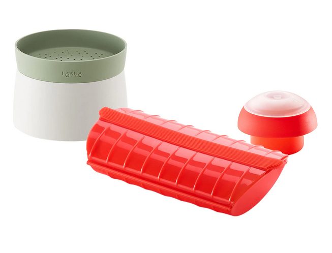 Si te has propuesto empezar a comer más sano, Lekue te lo pone fácil con su kit de iniciación de cocción. Está compuestos por un molde de silicona que sirve para cocer huevos y darles forma cúbica. Se pueden preparar huevos de múltiples maneras, tortillas al baño maría o en el microondas, huevos pasados por agua, mollet… También incluye un cocedor de silicona para preparar arroz y quinoa en el microondas de forma rápida y limpia. En pocos minutos podemos disfrutar de comidas saludables, y al terminar, lavar los moldes en el lavavajillas.