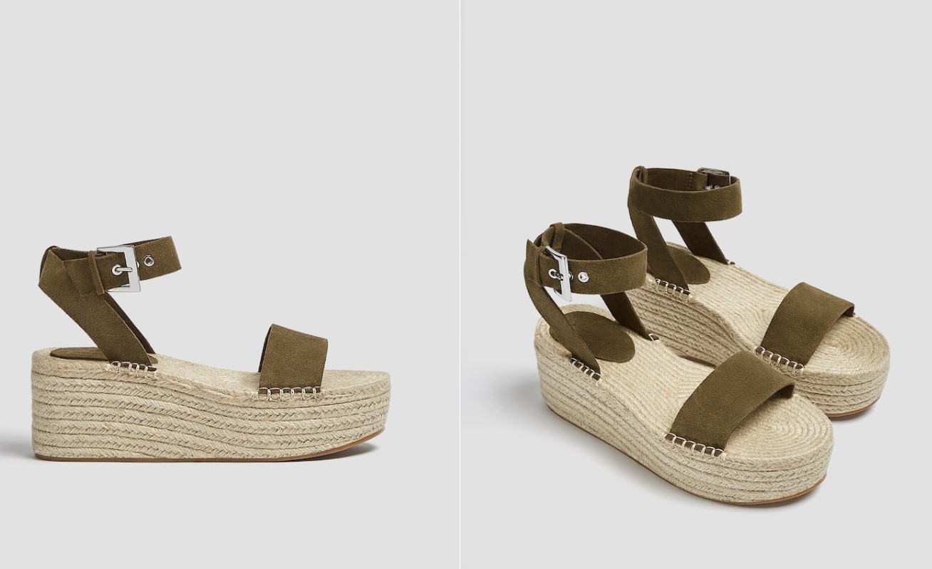Seguimos con el listado de cuñas y alpargatas de Pull&Bear que elegimos para usar este verano, ya que aportan comodidad debido a su suela. Vimos este modelo de alpargatas con cuña y serraje de piel de color caqui. La cuña está forrada de yute. El cierre se realiza mediante hebilla en pulsera al tobillo, lo que las hace muy cómodas y apropiadas incluso para caminar, ya sea hacia la oficina o dando un paseo. Altura de la cuña es de 6.7 cm. Está disponible en los talles del 35 al 41. Su precio está rebajado a 19,99 euros.