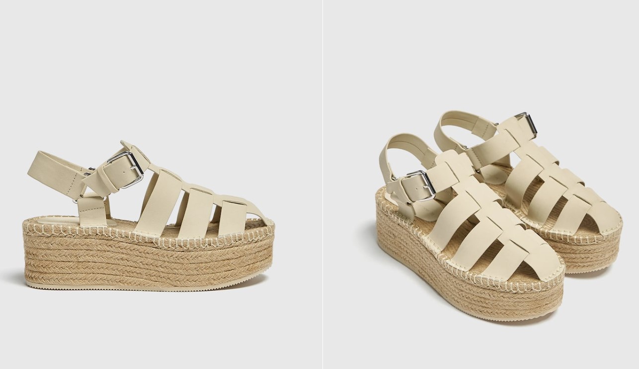 Seguimos con el listado de cuñas y alpargatas de Pull&Bear que elegimos para usar este verano, ya que aportan comodidad debido a su suela. Vimos este modelo de sandalias con cuña tipo cangrejera con tiras en el corte y cierre mediante hebilla. Esto proporciona al pie una buena sujeción que las hace especialmente cómodas. Está disponible en varios colores. La cuña está fabricada de yute y la altura es de 6 cm. La consigues en los talles del 35 al 41. Su precio de lista es de 35,99 euros.