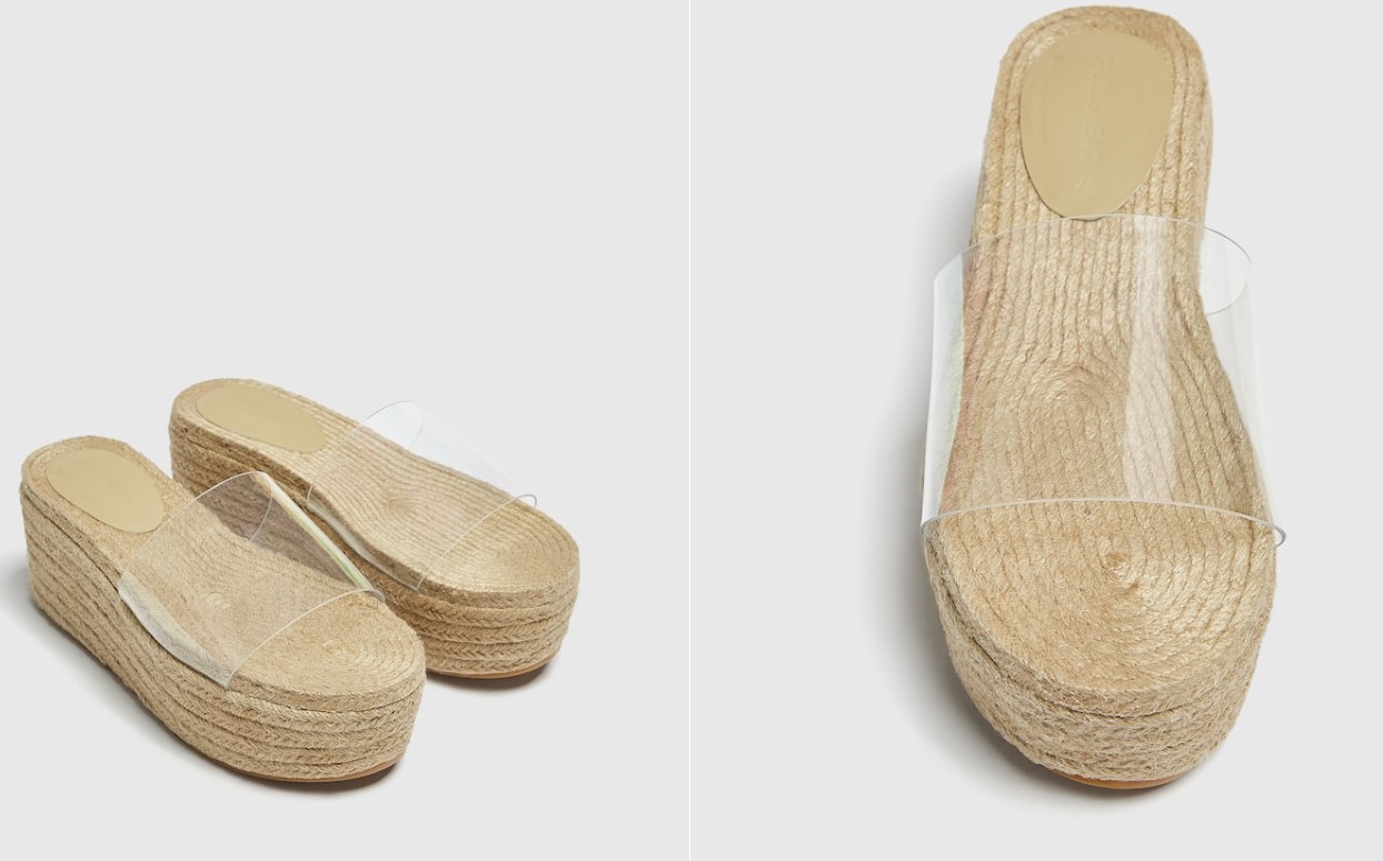 Seguimos con el listado de cuñas y alpargatas de Pull&Bear que elegimos para usar este verano, ya que aportan comodidad debido a su suela. Vimos este modelo de sandalias con cuña de color transparente. Tiene una tira de vinilo en el corte. La cuña está forrada en un material tipo yute y la altura es de 7.5 cm. La consigues en los talles 35, 40 y 41. Su precio está rebajado a 17,99 euros.