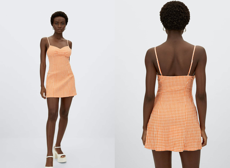 A la venta por 15,99 euros gracias a un descuento del 38%, se trata de un vestido midi de tirantes finos y escote corazón ajustado, con estampado vichy. Está disponible tanto en color naranja como en negro.