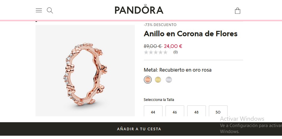 El hermoso anillo corona de flores cuenta con un recubrimiento electrolítico en oro rosa de segunda ley de 14k. inclusive, tiene una aleación única de metales, con plata de baja aleación y cobre con un recubrimiento de oro de segunda ley. Además, está adornado con circonitas cúbicas transparentes. Entonces, si lo desean comprar solo tienen que entrar a Pandora por 24,00 €.