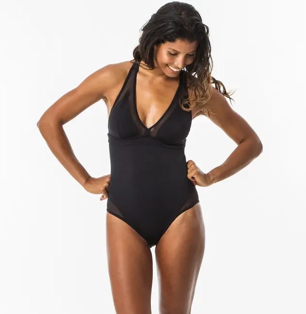 ¿Buscas un bañador que te permite una total libertad de movimientos? ¿Valoras la comodidad cuando vas a la playa porque lo que quieres es disfrutar del mar? Este bañador de Decathlon combina lo práctico con un diseño estético y favorecedor, con un bonito escote en V, espalda cruzada, estilo nadadora, y detalles de trasparencias. Es de color negro y está diseñado por mujeres expertas en surf, que necesitan una prenda que se que mantenga en su sitio incluso en un fuerte oleaje. Su precio es de 24,99€.
