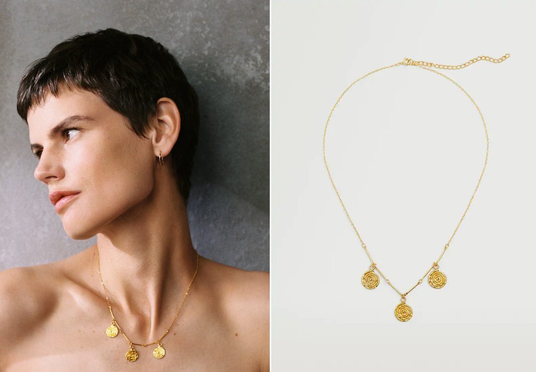 No solo prendas puedes encontrar en la sección de novedades de Mango. Otras de las cosas que debes tener en cuenta para lucir elegante son los complementos. En este caso, destaca este collar, con pequeños colgantes en forma de moneda, gracias a su sofisticado tono dorado. Además, te puedes hacer con él por tan solo 12,99 euros.