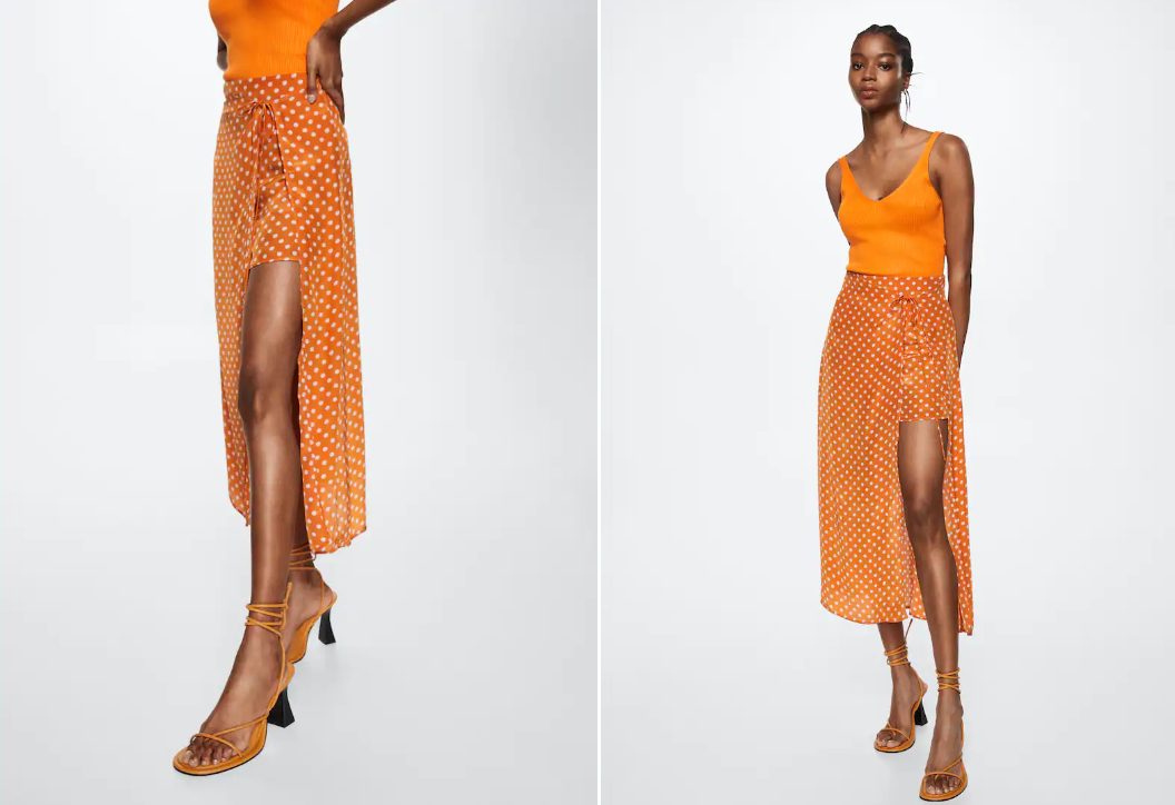 Los lunares son uno de los estampados que más van a triunfar durante todo el verano y así lo demuestran desde Mango con esta llamativa falda de corte midi. Con una parte de minifalda y otra larga, será la prenda ideal para construir un look llamativo con tan solo una pieza. Además, la tienes disponible por solo 29,99 euros en la tienda.