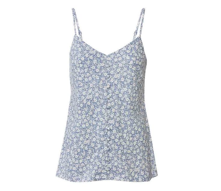Esta camiseta de lino es otra de las propuestas del catálogo de verano de Lidl. Tiene un bonito estampado de pequeñas flores blancas sobre un fondo azul claro, y es de corte ancho, muy confortable, cómodo y fresco. Es de tirantes, finos y regulables, con cuello de pico y botones forrados decorativos en el frontal. Hay tallas desde la S a la L y cuesta solo 6,99€.