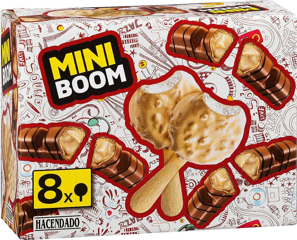 El mini boom es un helado con sabor a Kinder, de hecho quienes lo han probado describen su sabor como una versión helada del Happy Hippo. También se parece al famoso Turron Cream Avellana de Mercadona. Está elaborado con leche tostada y está recubierto con una crujiente capa de galleta, avellanas en trocitos, con un interior cremoso de crema de nata. Estos mini Kinder son absolutamente delictivos y se venden en packs de 8 unidades por 2,55€.