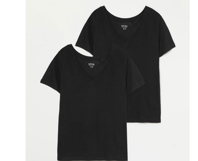 Son 2 camisetas básicas lisas con escote en forma de pico y manga corta. Elaboradas con un tejido fluido, mezcla de algodón y modal, que aporta una gran comodidad. Con el 37% de descuento se quedan en 4,99 euros. Las tienes en blanco, marino y negro.