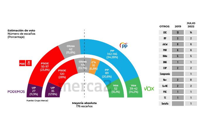 Según los datos recabados por la compañía, entre el 7 y el 9 de julio, de realizarse en este momento unas elecciones, el Partido Popular de Feijóo obtendría entre 142 y 146 escaños, lo que representaría un incremento de 64% en el número de diputados del partido azul, y lo dejaría cada vez más cerca de poder obtener los 176 escaños que le darían la mayoría absoluta en el Parlamento.