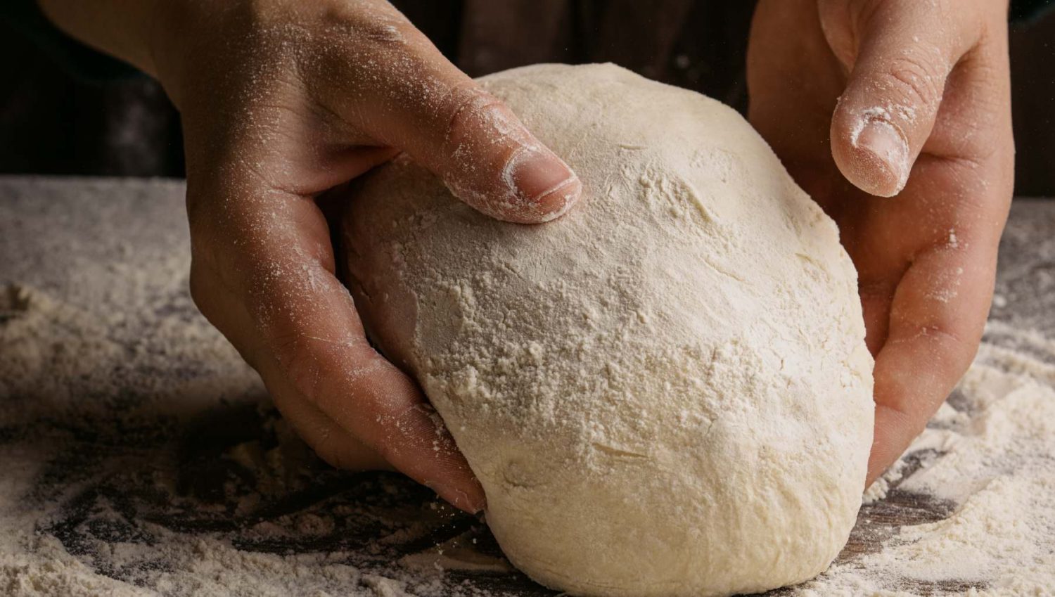 Toca, como habrás visto a los pizzeros, ponerse en la encimera bien limpia y verter bastante harina. Después echaremos la masa sobre la harina para que no se quede pegada a la encimera y amasamos sin parar durante 4 o 5 minutos. Si se nos pega a la encimera, deberemos echar más harina sobre ella.