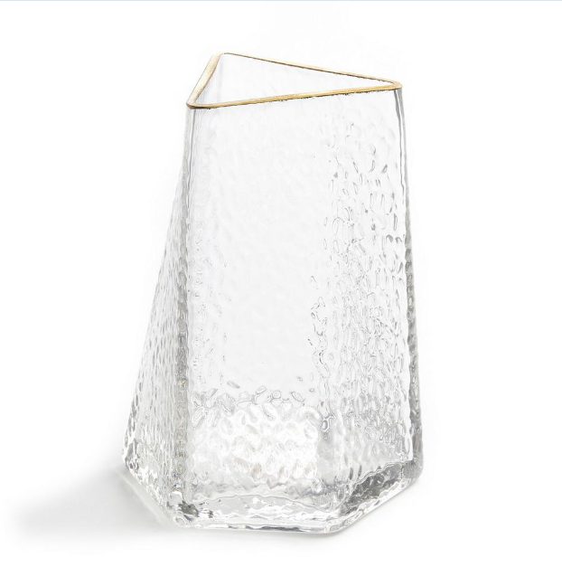 3Recipiente hexagonal de vidrio transparente con borde dorado