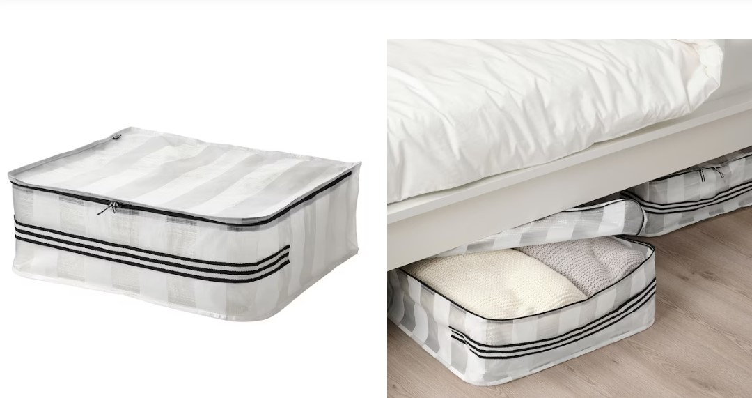 En la misma línea de bolsas de almacenamiento también encontrarás en Ikea un ejemplar disponible para el resguardo de la ropa o de mayor cantidad de calzado. Este es un modelo similar al anterior, confeccionado con polipropileno y cremallera de zinc, en color blanco con transparencias. Puede ser usada para organizar y proteger ropa, calzado o diferentes objetos dentro de una maleta, o puede fungir propiamente como maleta, porque dispone de una práctica asa para transportar como tal. Mide 19 x 55 x 49 cm de alto, ancho y fondo, y tiene un precio en Ikea de 4,00 €.