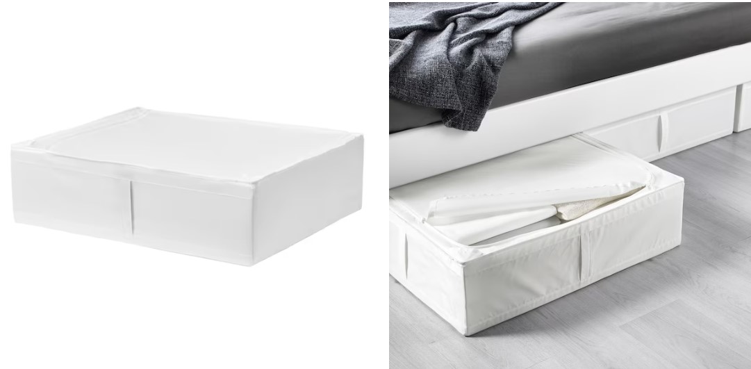Esta es otra de las bolsas que consigues en Ikea, diseñada utilizando poliéster al 100% de origen reciclado. Es ideal para proteger su contenido del polvo y resguardar de forma segura, ya que es resistente y dispone de rejillas que permiten el paso de aire para evitar la concentración de humedad o de olores desagradables. Se debe limpiar con un paño húmedo para mantenerla. Viene con ajuste de cremallera de plástico y con unas medidas equivalentes a: 93 x 19 x 55 cm; 69 x 19 x 55 cm; o 44 x 19 x 55 cm. Está disponible en color blanco y en color gris. Los precios varían de acuerdo al tamaño seleccionado: 9,00 €, 8,00 € y 7,00 €.