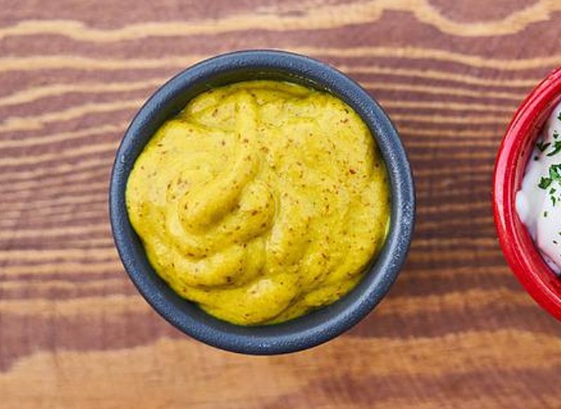 Para preparar esta salsa, que aporta 26 kcal por cucharada, hay que lavar 50 gramos de semillas de mostaza blanca, que se mezclan con 75 ml de vinagre de vino blanco o manzana, 30 ml de agua, 30 ml de vino dulce, una cucharada de azúcar moreno, sal y cúrcuma. Se podrá consumir después de dejar reposar un día en la nevera.