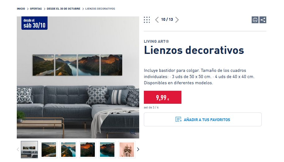 Es uno de los increíbles chollos que pueden conseguir en esta oferta que está ofreciendo la tienda. Ya que, estos son perfectos para decorar cualquier parte de tu hogar por el increíble diseño y estilo que tiene. Además, lo pueden obtener en diferentes modelos, por lo que lo hace aún el preferido de las personas que aman los diseños decorativos. Para que puedan comprar estos hermosos lienzos decorativos lo pueden hacer por Aldi a un precio de 9,99 €.