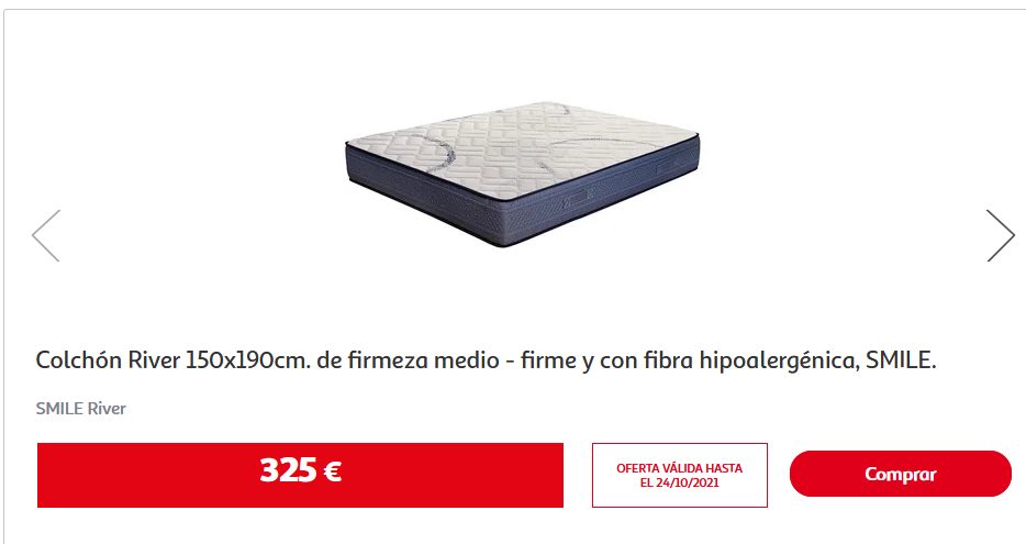 Es un increíble colchón river que cuenta con unas medidas de 150X190cm, por lo que es perfecto de usar en nuestro dormitorio. Además, es de firmeza medio y firme, cuenta con unas fibras de hipoalergénicas para las personas que padecen de alergia. Por lo que, es uno de los más vendidos en estas ofertas que ofrece la tienda. Entonces, si desean comprar este colchón river solo deben entrar a Alcampo por un increíble precio de 325 €.