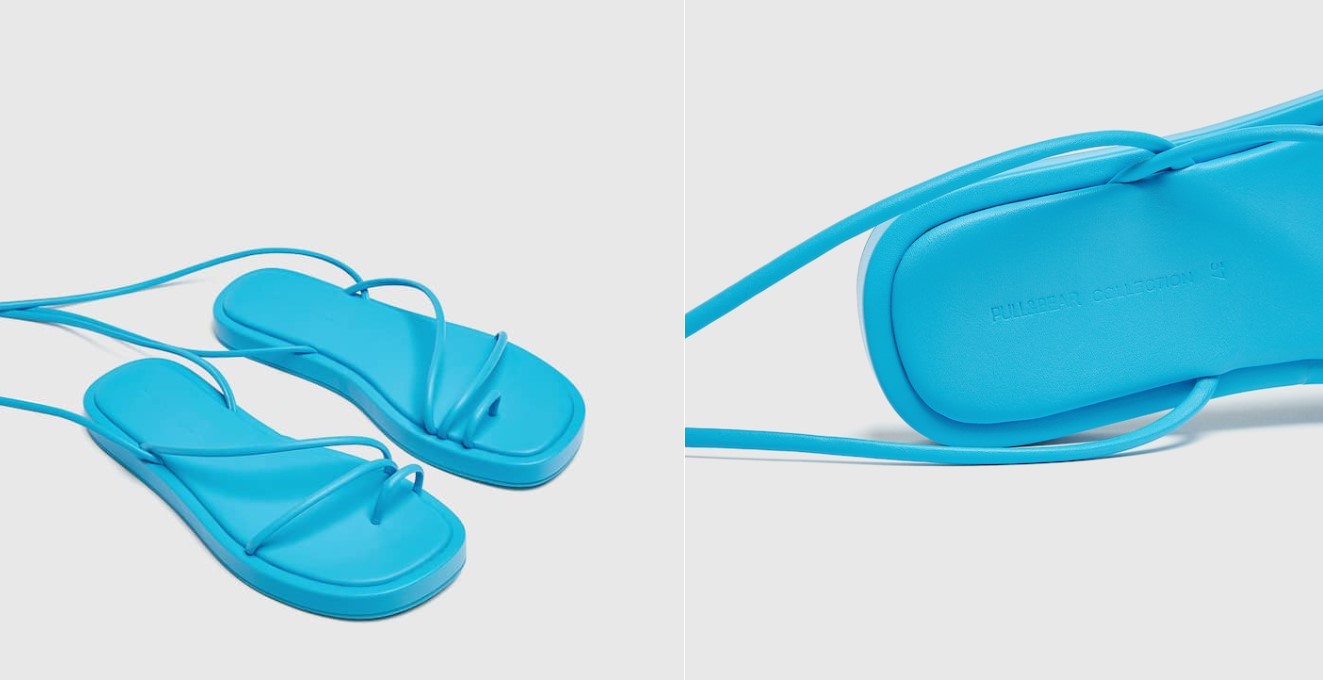En la sección rebajas de Pull&Bear vimos esta sandalia plana de tiras finas, disponible en varios colores: azul, marrón, verde y negra. Tiene un cierre mediante atado al tobillo y la altura de la suela es de 2 cm. Aportan elegancia y estilo al look gracias a este color azul turquesa que hemos seleccionado. Solo quedan en talle 38 y 39. Su precio es de 15,99 euros.