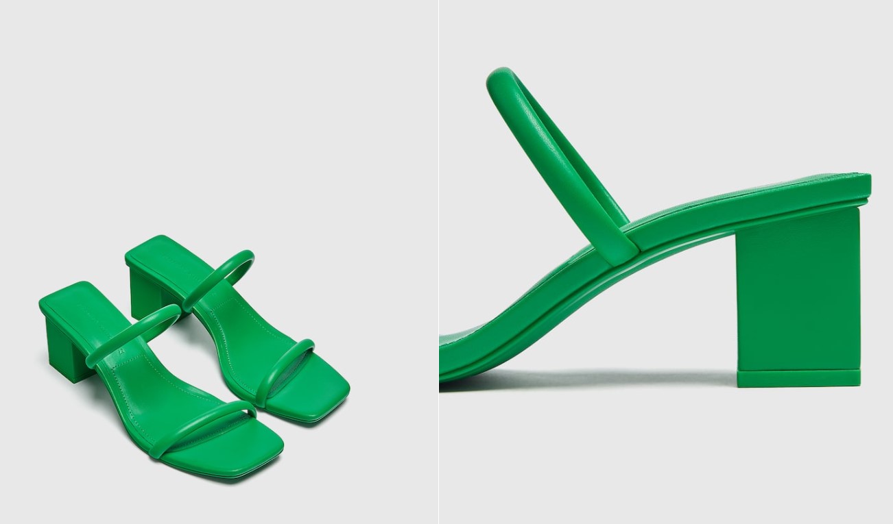 En la sección rebajas de Pull&Bear también vimos esta sandalia de tacón disponible en varios colores: verde, como la de la foto, azulón y naranja. Tiene tiras finas en el corte y la altura del tacón es de 5.5 cm. Su diseño no es nada fuera de lo común, pero es en su carácter minimalista y un tanto clásico que gracias al color que elijas, ayudará a completar cualquier look. Su precio es de 12,99 euros.