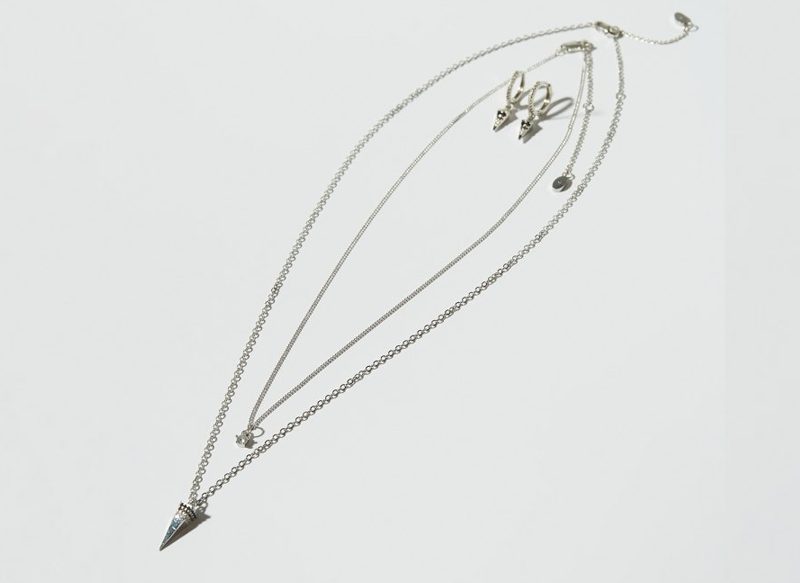 Se trata de un conjunto de dos chokers y pendientes aro en acero inoxidable con diseño de cuernos con zirconitas. Los chokers tienen unas medidas de 42 y 39 cm de largo, y los pendientes un diámetro de 1 cm.