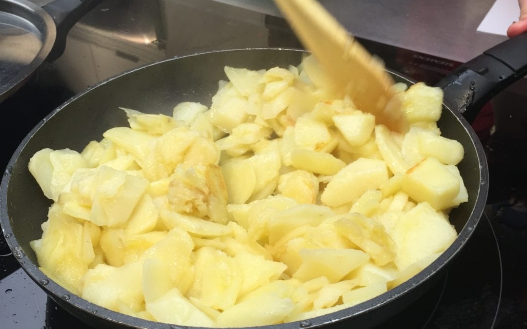 Una de las claves determinantes para una buena tortilla de patatas es la patata. Por supuesto es importa mucho la calidad, y el tipo de patata, pero además es importante cómo se prepara la patata para incorporarla a la tortilla. Escogemos unas cinco o seis patatas – en torno al kilo y medio – y las cortamos en láminas finas de unos 2 centímetros de grosor. Las llevamos a una sartén grande – si es pequeña se amontonan demasiado y unas se harán más que otras – con bastante aceite y las freímos, pero no demasiado. Tenemos que dejarlas como si estuvieran cocidas, con un aspecto y consistencia tiernas pues seguirán haciéndose cuando les incorporemos el huevo.