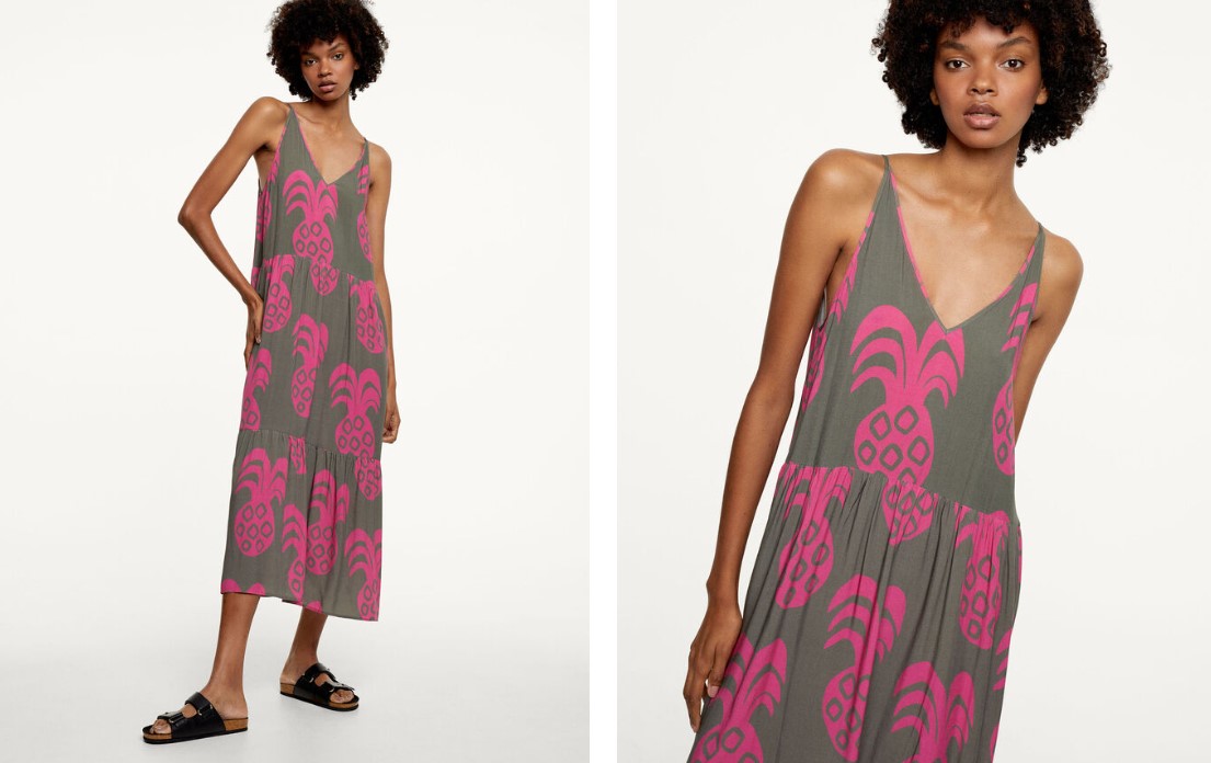 Seguimos con el listado de vestidos bohemios con diseños muy bonitos, ligeros y frescos de Parfois para lucir estas vacaciones. Elegimos este diseño de vestido largo de tirantes, con cuello de pico. Está disponible en colores naranja, amarillo o rosa. El producto está disponible en talla única, diseñado para crear las siluetas más variadas y adaptarse a diferentes tipos de cuerpo. Su composición es 100% Liocel y cuesta 32.99 €.
