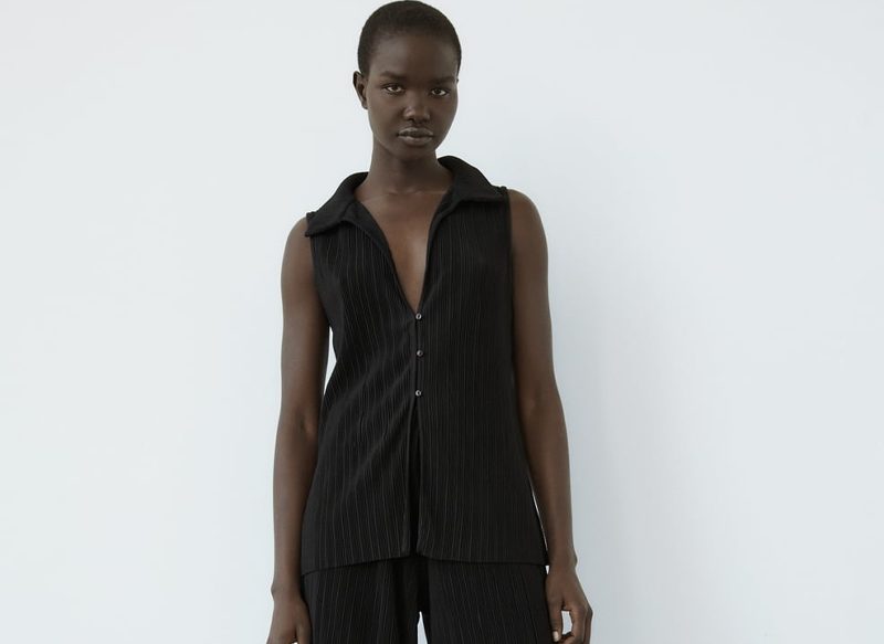 En Zara se pueden encontrar a precios muy reducidos prendas que pueden llegar a ofrecerte muchas posibilidades a la hora de vestir, siendo un claro ejemplo esta camiseta plisada que se vende tanto en negro como en verde.