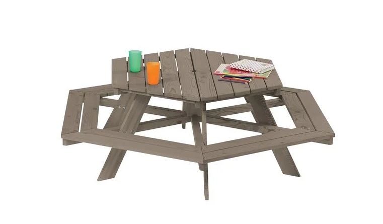 Se trata de esa composición de mesa y bancos de madera, que cuentan con acabados redondeados. Es muy resistente porque dispone de un baño de barniz a base de agua. Así que, parece que las ventajas son los principales detalles. Además de que cuenta también con un pequeño hueco para poder colocar una sombrilla. Sí, los más pequeños también necesitan estar protegidos del sol y más, si se van a pasar un rato largo sentados en esta mesa.