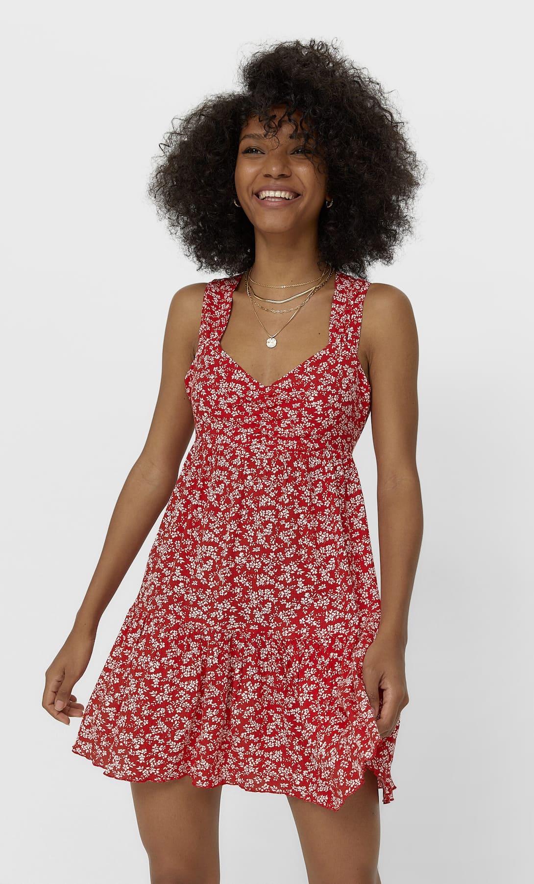 En los pequeños detalles encontramos la diferencia y así nos lo demuestran una vez más desde Stradivarius. Un claro ejemplo lo tenemos en este vestido de flores, en un bonito y llamativo color rojo, con un delicado estampado.