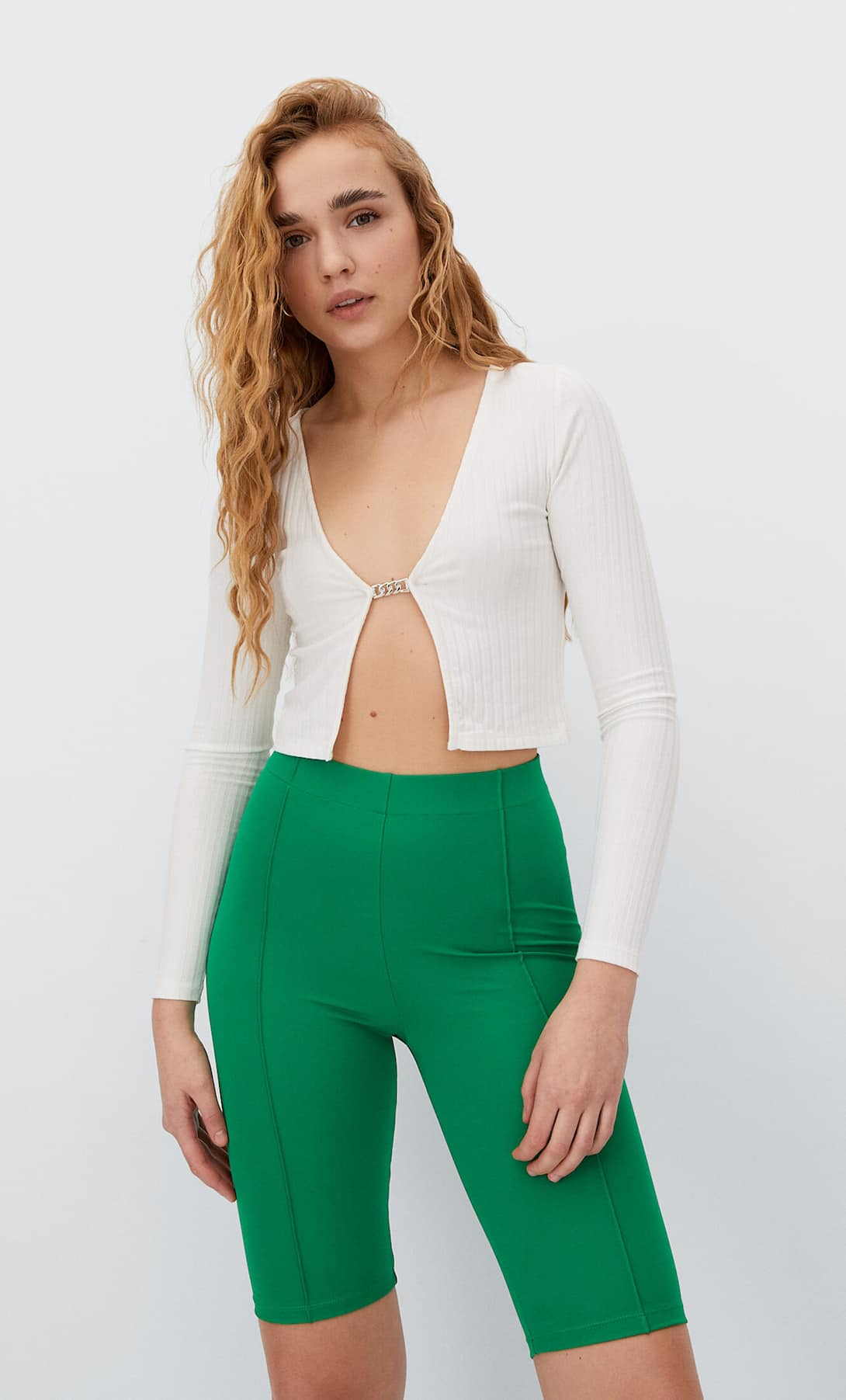 Otra de las opciones más cómodas que podrás encontrar en la sección de descuentos de Stradivarius son estas mallas ciclista. Además, están disponibles en un bonito y llamativo color verde que hará que se conviertan en la pieza central de tu look. En cuanto a su precio, ahora las tienes disponibles por tan solo 5,99 euros en vez de 9,99. Una buena oportunidad.