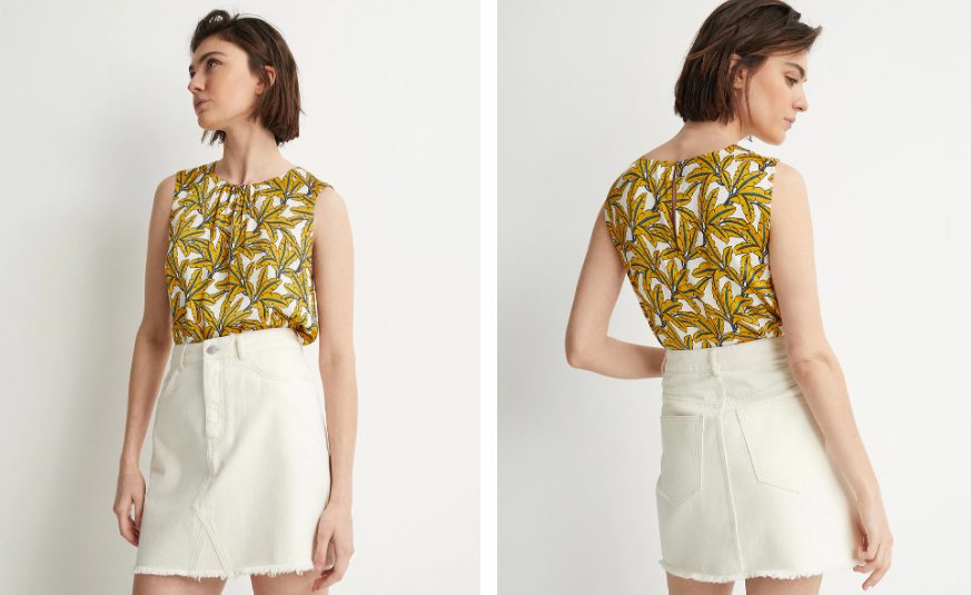 Vamos con un top por un céntimo más, a un precio de 3 euros. Se trata de esta prenda de Sfera sin magas satinado y que lo puedes comprar en amarillo, en azul, marrón, azul marino, marrón claro y mostaza. Es un top estampado de lunares, con cuello caja y cierre trasero de lágrima. Está hecho 100% poliéster y tiene un descuento del 70% para llegar a esos 3 euros. Una gran oportunidad que puede ser tuya aquí.