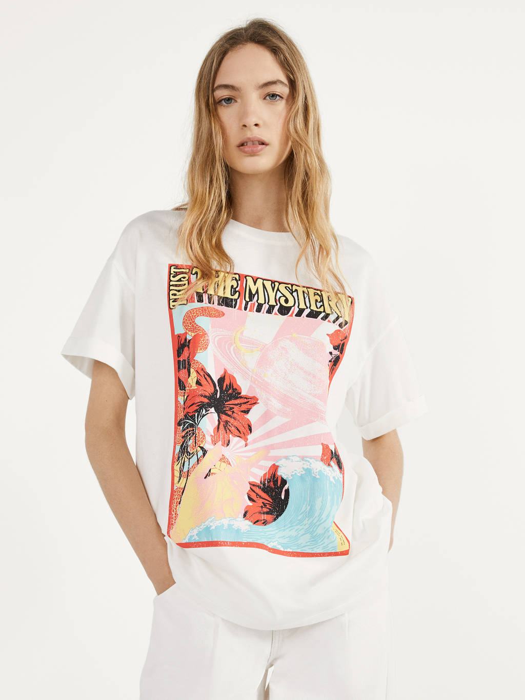 No sólo de vestidos se vive en el buen tiempo. Siempre hay momentos para lucir unos pantalones con una camiseta informal pero bonita. Esta camiseta es ideal para ello y a un precio fabuloso. La puedes conseguir en la tienda física u online en color crudo y es 100% algodón. Lo puedes combinar con unos cómodos pantalones Jeans Balloon Fit por 25,99 € y completarlo con unas bonitas sandalias con tacón y tiras con pulsera por el mismo precio que el pantalón.
